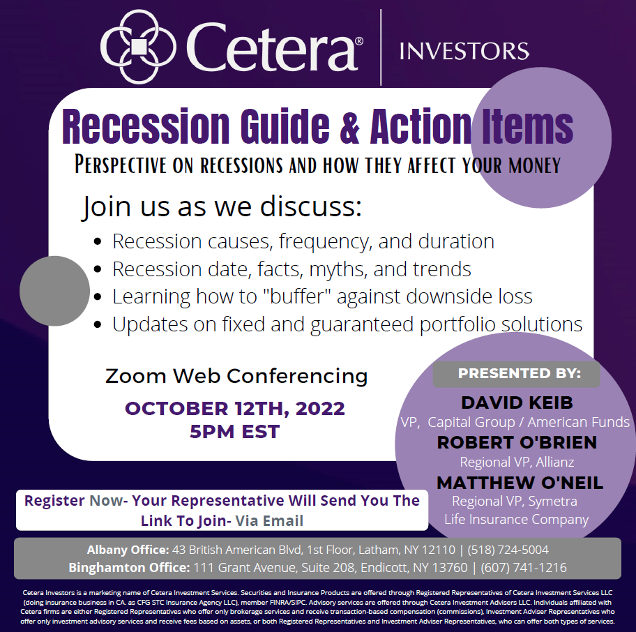 Cetera Investors is a marketing name of Cetera Investment Services. Securities and Insurance Products are offered through Registered Representatives of Cetera Investment Services LLC (doing insurance business in CA. as CFG STC Insurance Agency LLC), member FINRA/SIPC. Advisory services are offered through Cetera Investment Advisers LLC. Individuals affiliated with Cetera firms are either Registered Representatives who offer only brokerage services and receive transaction-based compensation (commissions), Investment Adviser Representatives who offer only investment advisory services and receive fees based on assets, or both Registered Representatives and Investment Adviser Representatives, who can offer both types of services.